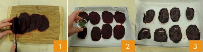To prepare the pasta with three pestos, start with the beetroot pesto: peel the beetroots, then cut them into slices about a quarter-inch thick 1. Line a baking sheet with parchment paper and arrange the beet slices so they do not overlap. Sprinkle them with salt to taste and chopped thyme 2, drizzle with a little oil, and bake in a preheated static oven at 392°F for 30-35 minutes (or in a fan oven at 356°F for about 25-30 minutes). Once cooked 3, let the beetroots cool,
