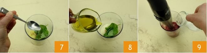 to add a few drops to the rest of the ingredients, along with the pine nuts and basil leaves 7. Then pour in the oil 8 and blend everything with the immersion blender, pouring in the fresh liquid cream 9 in a thin stream until you get a smooth cream.