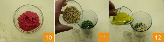 Transfer the obtained pesto into a small bowl 10. Continue the preparation with the marjoram pesto: pick the marjoram leaves from the stems and place them in a tall container to blend them with the pine nuts 11; add the oil 12,