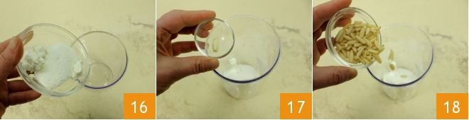 Finally, move on to the cheese pesto: in the tall container, place the fresh ricotta 16, then add the half garlic clove 17, the pine nuts 18,