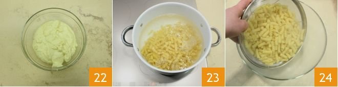until you get a homogeneous mixture 22. Bring water to a boil in a pot and cook the pasta until al dente 23, then drain it, keeping a little cooking water, and place it in a bowl 24.