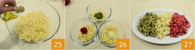 Dress it with a bit of oil 25 and divide it into three bowls to season each with the three different pestos 26 (if necessary, add a little cooking water to make the pasta creamier). This way, you'll bring to the table the pasta with three pestos in a tricolor dish to taste each one 27!