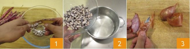 To make the fresh borlotti bean salad, start with the legumes: shell them and collect the beans in a bowl 1: you will get 270 g of cleaned beans. Place a large pot filled with water on the stove, and as soon as it reaches a boil, add the borlotti beans 2. Cook for about 35 minutes without a lid. Meanwhile, clean the shallots 3