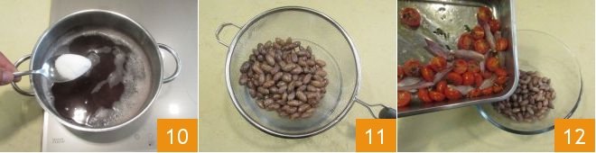 Meanwhile, the 35 minutes of bean cooking time will have passed, add salt 10 and continue cooking for another 5 minutes. Once done, turn off the heat, drain the beans 11 and transfer them to a bowl, also add the cherry tomatoes and shallots cooked in the oven 12. Adjust salt, pepper