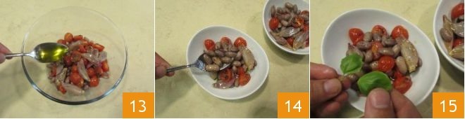 and season with 2 teaspoons of olive oil 13. Mix to flavor and serve the fresh borlotti bean salad on plates 14 with fresh basil leaves 15.