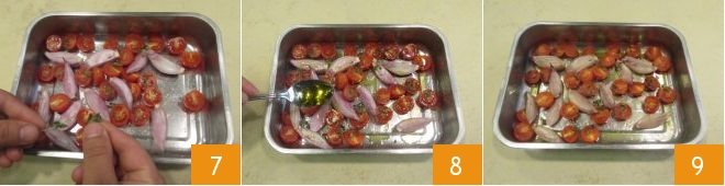 and cut them into four parts 4. Wash the cherry tomatoes and cut them in half 5. In a baking tray, add the cherry tomatoes and shallot wedges 6.