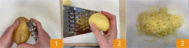 To prepare frico with potatoes and onions, start by peeling the potatoes 1, then grate them using a coarse grater 2. Set them aside for the moment 3.