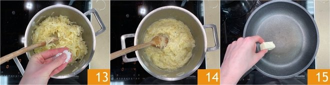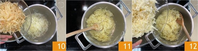 Let them soften for about 15 minutes, stirring often with a wooden spoon to prevent sticking or excessive browning. When they are soft, add the grated potatoes 10 and continue cooking for about 10 minutes over medium-low heat, stirring from time to time 11. Then add the grated cheese 12.