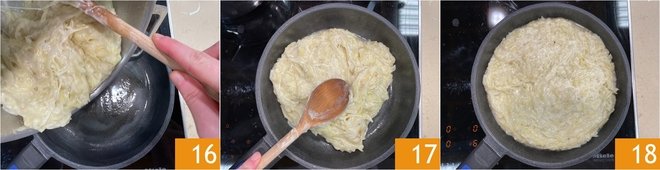 Pour the mixture into the skillet 16, draining any excess fat if necessary. Spread it evenly and press it down slightly with the back of a spoon to level the surface 17. Cover with a lid and cook over medium-high heat without stirring, as you would an omelet, until a golden crust forms. This will take about 15 minutes.