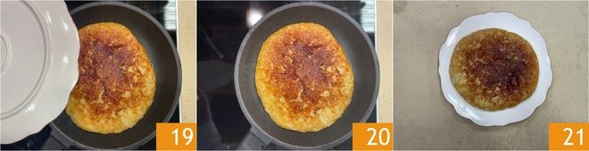 Remove the skillet from the heat and let it rest for a moment, then turn the frico over using a plate 19 or a lid. Return it to the heat and cook the other side for about 10 minutes, until the color is evenly golden 20. Finally, let it cool slightly before transferring to a serving plate 21. Wait a couple of minutes and serve the frico with potatoes and onions while still hot!
