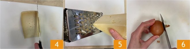 Move on to the cheese: remove the rind from the Montasio 4 and grate it with a coarse grater as well 5, so it will melt evenly during cooking. Now take care of the onions: first, peel them 6.