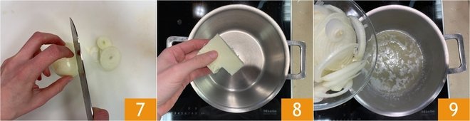 Slice them thinly into rounds 7. In a large pan, melt about 2 tbsp (approximately 30 g / 1.1 oz) of butter over low heat 8, then add the onions 9.