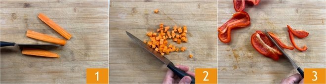 To prepare the fridge-clearing quiche, first wash all the vegetables well. Peel the carrots and cut them first into slices 1 and then into 0.5-inch cubes 2. Move on to the peppers: first, cut them in half and remove seeds and internal filaments. Then cut into strips 3.