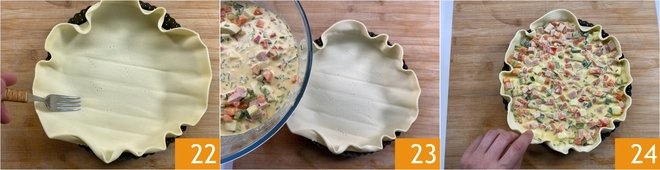 Unroll the puff pastry and transfer it into a 9.5-inch removable bottom mold. Prick the base with a fork 22 and transfer the mixture inside 23. Then pinch the edges of the dough inward 24.