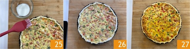 Brush the edges of the dough with cream 25 26. Cook in a preheated static oven at 350°F for 40 minutes in the lowest part of the oven, not in direct contact with the oven. Then switch to the fan mode and cook for another 10 minutes 27.