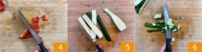 From these, cut cubes of the same size as the carrots 4. Now trim the zucchini and cut them first into slices 5 and then into cubes always 0.5-inch large 6.