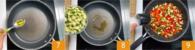 Now pour a drizzle of oil into the pan 7, heat it, and add the vegetables 8. Season with salt and pepper 9 and cook on medium-high heat for about 8 minutes.