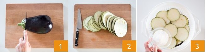 To prepare the fried eggplant and prawn rolls, first wash the eggplants, then trim them 1 and cut them into thin, even slices 2. Place them in a colander and sprinkle with salt 3. Let them drain for 20 minutes to reduce bitterness.