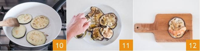 grill them on both sides 10, then transfer them to a plate and drizzle with a little oil 11. Everything is ready to assemble the rolls: on a cutting board, place a slice of eggplant, put a shrimp on one side 12