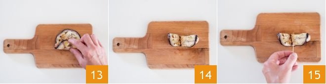 and wrap the eggplant slice around the shrimp 13 to create a roll 14. Secure it with a toothpick 15 and set aside.