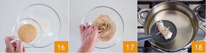 In a bowl, mix the breadcrumbs and flour 16, coat the rolls one by one in this mixture 17, then heat the oil for frying in a pan and, when it reaches 340°F, immerse a few rolls at a time 18.