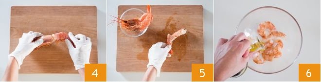 Meanwhile, clean the shrimp: cut off the head 4, remove the legs and shell 5, and use a toothpick to remove the intestine, the dark filament along the back. Transfer the whole, cleaned shrimp to a bowl, and season with oil 6,