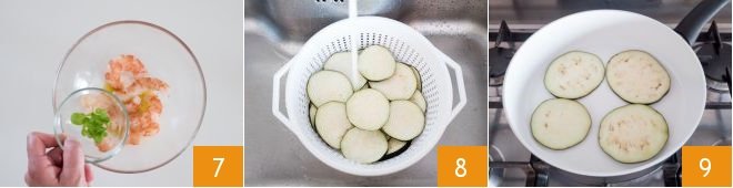 salt, pepper, and fresh mint leaves 7. Rinse the eggplants under running water 8 and dry them, then heat a non-stick pan and place the eggplants in it 9,