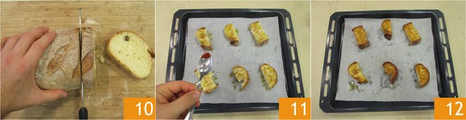 While the mushrooms cook, slice the bread 10, place it on a baking sheet lined with parchment paper and sprinkle the surface with oil, salt, pepper, and a pinch of smoked paprika 11 and toast in a preheated oven at 392°F, in the upper part (not in direct contact with the heating element) for about 5-6 minutes 12.