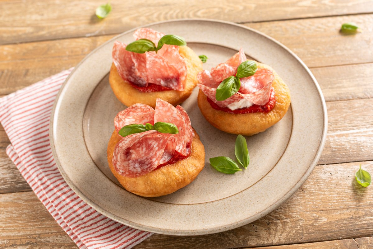 Montanarine, also known as fried pizzas, are typical treats from Campanian street food that know how to win you over at first bite. Soft, golden, and slightly crispy on the outside, they are characterized by their round shape with a hollow center: a small cradle perfect to fill with your favorite toppings. In this tasty and irresistible version, we offer fried montanarine with Milano salami and stracciatella, a tantalizing and creamy mix that will drive your guests crazy. The tomato sauce base, essential in the traditional recipe, holds a generous tablespoon of fresh stracciatella, completed with slices of salami, with a sweet and intense flavor, and a few basil leaves for a fragrant touch. Perfect to serve as an appetizer, fried montanarine with salami and stracciatella are also ideal for an aperitif or a buffet!
