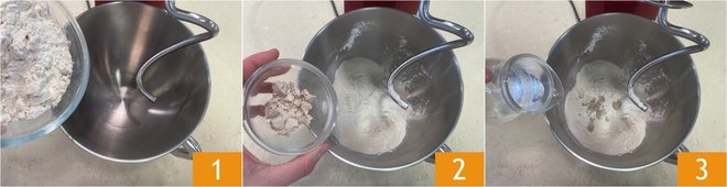 To prepare the fried montanarine with salami and stracciatella, start with the dough: in the bowl of the stand mixer, equipped with a hook, pour the flour 1, crumbled yeast 2, and water 3, then turn on the machine to mix all the ingredients together.