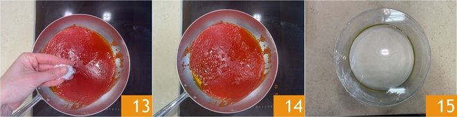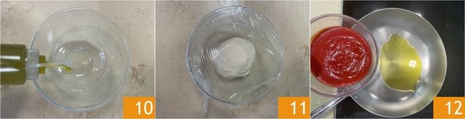 Grease a large bowl with oil 10, place the dough ball here, cover with plastic wrap 11, and let it rise in the switched-off oven with the light on for about an hour and a half. In the meantime, take care of the sauce: In a pan, pour a drizzle of oil and the tomato puree 12.