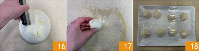 Transfer it to the slightly greased (or floured) work surface, then divide it into 12 dough pieces of about 1.75 ounces 16. Round the pieces of dough to form balls 17, then place them on a floured tray, cover with plastic wrap, and let them rise for another 30 minutes in the switched-off oven with the light on 18.
