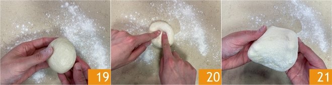 After this time, take the balls and stretch them on the floured work surface 19: pull the dough first from the edges and then press it in the center 20, being careful to give it a rounded shape and leaving the edge thicker 21.