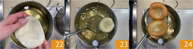 As you form the montanarine, you can fry them: heat the seed oil to a temperature of 340°F-355°F, then immerse the dough discs 22 and fry for about 5 minutes, pressing the center with a spoon, to maintain the shape during cooking 23. Once nicely golden, drain the montanarine 24.