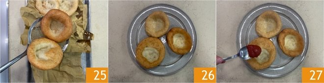 Transfer first to absorbent paper 25 and then to the serving plate 26. Fill the center of the montanarine with tomato sauce 27.