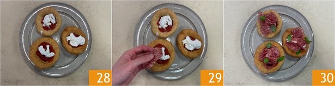 Add the stracciatella 28 and slices of salami 29, then complete with fresh basil leaves. Your fried montanarine with salami and stracciatella are ready to be enjoyed 30!