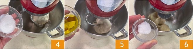 Add the sugar first 4 and then the olive oil 5. Wait for the oil to be completely absorbed, then add the salt 6.