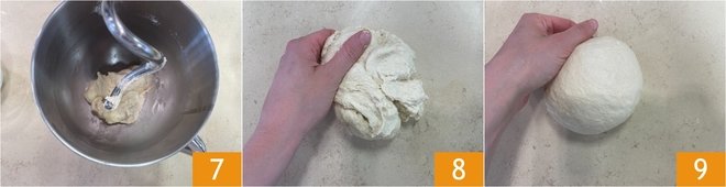 When the dough is well mixed and comes away from the sides 7, transfer it to the work surface 8 and give it a couple of folds as follows: gently stretch the dough and fold it like a wallet (first one side towards the center, then the other on top by pulling it), then cover it with a cloth and let it rest for 15 minutes. Repeat the folds once more and let it rest for another 15 minutes. At this point, form a dough ball 9.