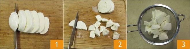 To prepare the fried mozzarella, first cut it into slices of 3/4 inch 1 and then into cubes 2. Place it in a sieve to drain 3.