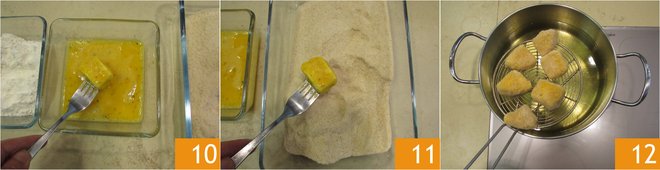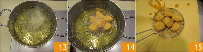 Make a double coating only in the egg 10 and breadcrumbs 11. In a saucepan, heat the seed oil, and when it reaches 340°F-356°F, dip the breaded mozzarella pieces 12 a few at a time.