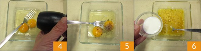 Meanwhile, in a bowl, beat the eggs with salt and pepper 4 5, then also add the milk 6.