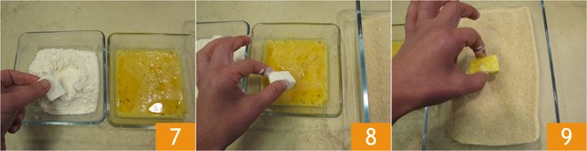 Drain the mozzarella well, then coat each piece first in flour 7, then in the egg 8, and then in breadcrumbs 9.