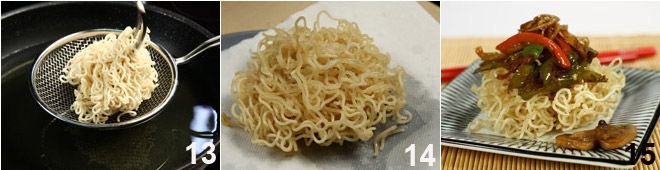 In a non-stick pan, heat some seed oil and when it reaches temperature, dip one nest at a time in the boiling oil 13. For this operation, we recommend placing each nest on a skimmer and maintaining the shape of the nests with the help of a large fork. When the nest is golden, turn it over and let it brown on both sides. Then proceed in the same way with the other nests and let them drain on absorbent paper 14. Then serve one nest per person and top it with the vegetable sauce 15.