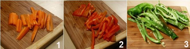 First, clean the vegetables, then cut the carrot into strips 1, the red pepper 2, and the green one 3.