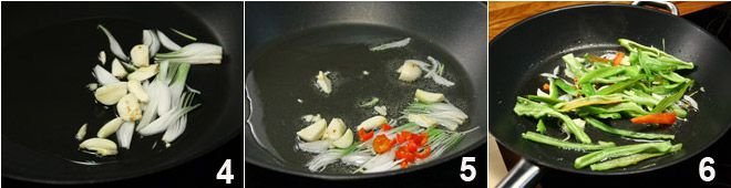 In a large pan or, if you have it, in a wok, heat 3 tablespoons of oil, then add the sliced garlic and spring onion 4, sauté for a few moments and then add the sliced chili pepper 5. Let it flavor and then add the peppers 6