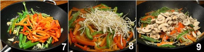 the carrot 7, the bean sprouts 8, and finally the champignon mushrooms 9. Allow a couple of minutes between the addition of each ingredient.