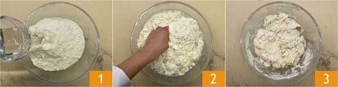 To prepare the fried pizza, first pour the flour and 2 1/3 cups of water into a large bowl 1, then knead with your hands 2 until the liquid is absorbed 3. Cover the mixture with the bowl and let it rest at room temperature for an hour.