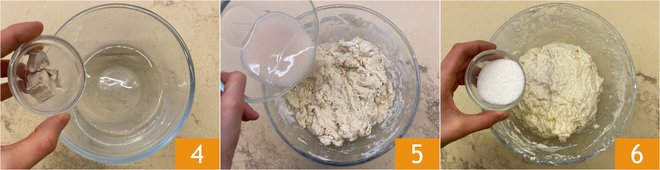 After the resting time, crumble the yeast in the remaining 3.4 oz of water 4, stir to dissolve it completely and add it to the dough 5. Knead with your hands to absorb the liquid, then add the salt 6.