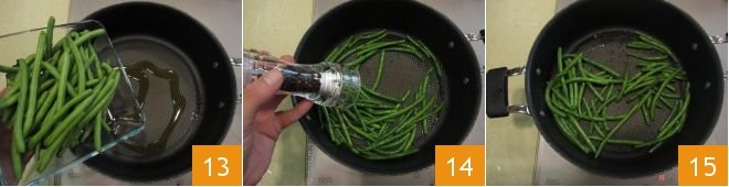 In the meantime, take care of the green beans. Pour a drizzle of oil into a pan, add the green beans 13, salt, pepper 14, and sauté over high heat for about 5 minutes 15.