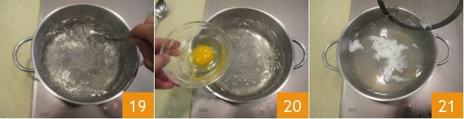 Now you can prepare your Poached eggs. Pour water into a large pan, turn on the heat, and add the wine vinegar. When the water starts to boil lightly, use a spoon to create a vortex 19 by stirring in the same direction. Then pour the egg into the center, for convenience crack it first into a small bowl 20. Cook the egg in this way for 2 minutes, without stirring or moving the egg 21.